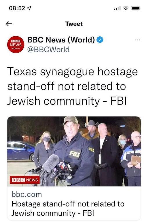 "I am grateful to be alive," the Rabbi held hostage in the synagogue said afterwards. The synagogue was relatively empty because of the ongoing Covid pandemic.